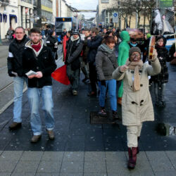 Einkaufspassagen wie Citypoint und Königsgalerie aber auch Geschäfte wie Leder Meid, Heinsins + Sander, Pelz Böttcher sowie die Ketten McDonald’s und Nordsee markierten Haltepunkte des Demozuges, an denen informative Redebeiträge vorgetragen wurden.